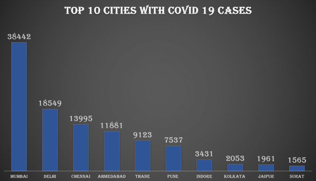 Almost 60% of all the cases in the country comes from 10 cities in the country. Another 6.5% comes from the next 10 cities. So only 20 cities put together contribute to over 66% of all the cases in the country. Mumbai, the financial capital of the country alone accounts for over 21% of the total number of cases in the country. In the top 10 cities there are three cities from Maharashtra ( Mumbai, Pune and Thane), two cities from Gujarat (Ahmadabad and Surat) and one city each from Rajasthan ( Jaipur) Madhya Pradesh (Indore), West Bengal (Kolkata) and Tamil Nadu (Chennai) respectively. The national capital region of Delhi also falls in the top 10 cities.