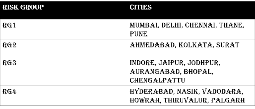 Based on the spread of COVID 19 and also the weekly growth rate, IPD groups the top 20 cities in terms of COVID 19 cased into 4 risk groups. The highest risk group has 5 cities of which three are from Maharashtra. Mumbai and Delhi both fall in this risk group. This risk group contributes to 48% of all the COVID cases in the country. A special task group needs to be created for each pf these 5 cities falling in the highest risk group.
