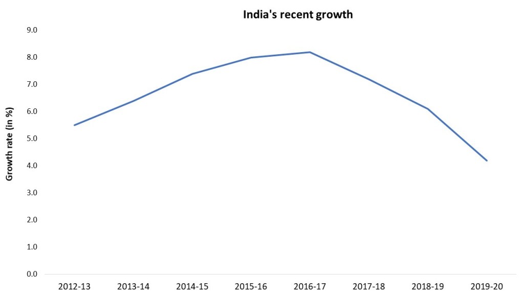 India’s growth rate in GDP has been secularly sliding in recent quarters, the ninth quarter in a row to reach a low rate of 3.1% in the last quarter of 2019-20. This decline follows a slow and fluctuating growth pick up since the beginning of the decade, which peaked in 2016-17, in the second quarter of that year to be specific. The decline since 2016 is sharper than the growth pick-up earlier, and the growth curve for the decade is an inverted V-shaped one!