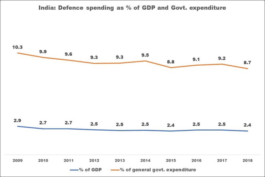 As can be observed, in the ten year period, military expenditure as a % of general government expenditure has declined from 10.3% to 8.7%. Similarly, seen as a % of GDP – military expenditure has dropped from 2.89% to 2.42%. In the last 4-5 years, it has largely hovered around the 2.4-2.5% mark. This however, is not unique to India. Even in China, a similar trend observed. China’s military expenditure as % of GDP was 2.06% in 2009 and has declined to 1.87% in 2018, although China’s absolute spending is estimated to have gone up from US$ 105.64 billion to US$ 250.0 billion in the same time.