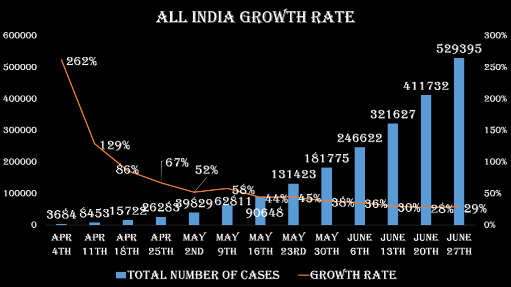 There are over 10 million cases of COVID-19 in the world today with over 501419 deaths. In India there has been 529395 ( covid19india.org) cases till 27th June with 16103 deaths. Here is a summary of the situation in India.