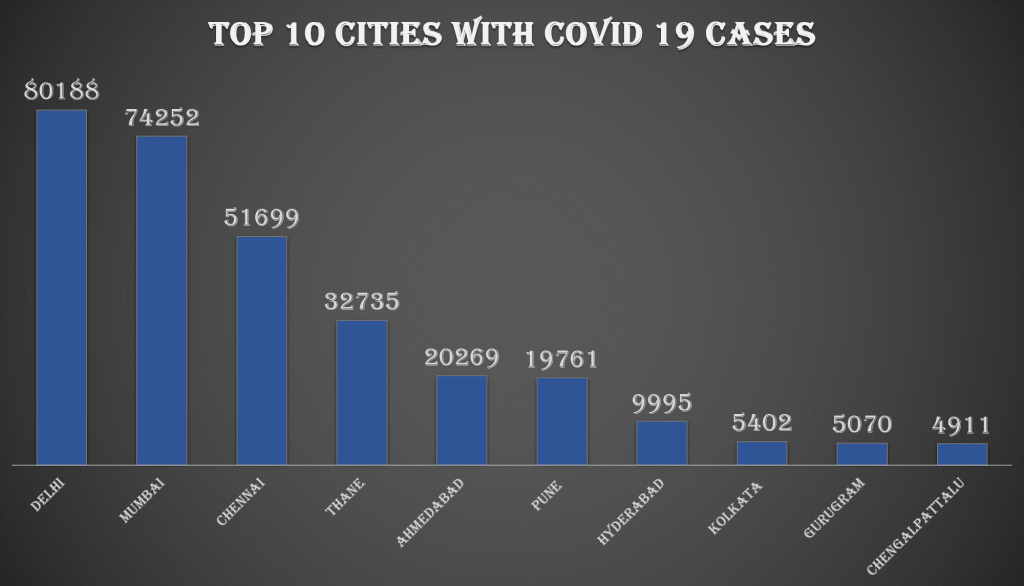 Almost 58% of all the cases in the country comes from 10 cities in the country. Another 7.2% comes from the next 10 cities. So only 20 cities put together contribute to over 65% of all the cases in the country. Delhi now has the highest number of cases followed by Mumbai. Both cities together account for 29.2% of the total cases in India. In the top 10 cities there are three cities from Maharashtra ( Mumbai, Pune and Thane), two cities in Tamil Nadu ( Chennai, Chengalpattalu) one city each from West Bengal (Kolkata), Telangana (Hyderabad), Gujarat (Ahmadabad) and Haryana (Gurugram) respectively. The national capital region of Delhi also falls in the top 10 cities. Both the financial capital and the political capital of the country are in a alarming situation.