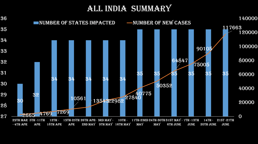 There are over 117663 new cases in the week of 21st to 27th June with 35 states and Union territories impacted all across the country. The weekly growth rate marginally increased from last week. There has been a 29% increase in the total number of cases in the week. During this week there has been a 21% increase in the total number of deaths from 13277 in the week ending on 20th June to 16103 in the week ending on 27th June. So in this week the growth rate of number of deaths was lesser than that of the overall cases.