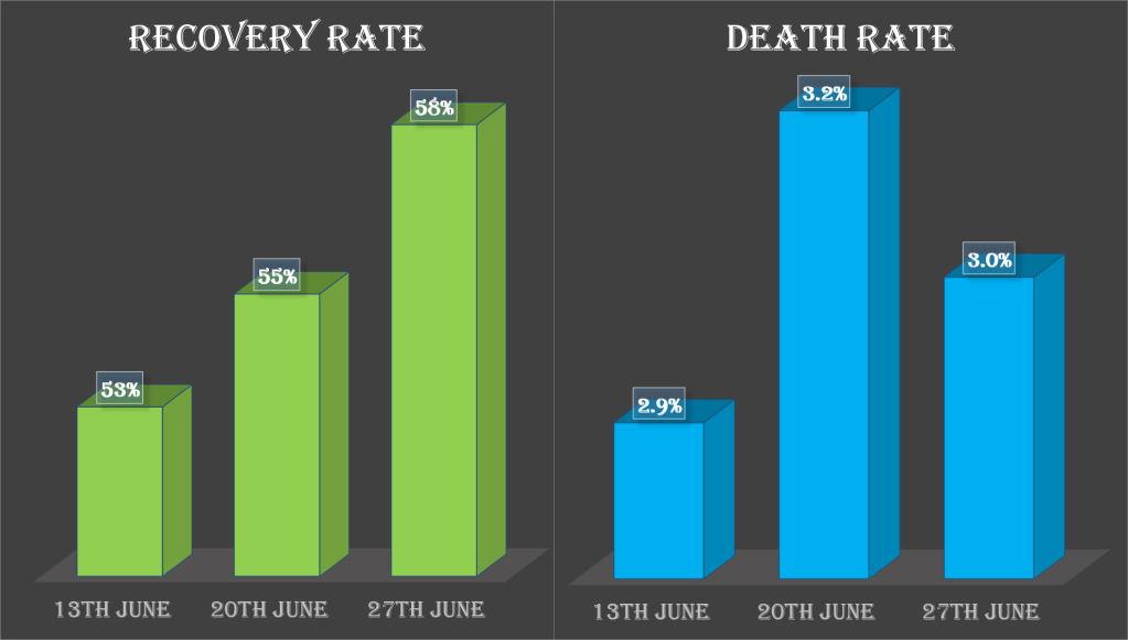 India has maintained a high recovery rate of 58% till June 27th. This is higher than the world recovery rate of 54%. There has been a increase in recovery rate also this week. In terms of death rate, India has lower death rate as compared to the world death rate of 5%.