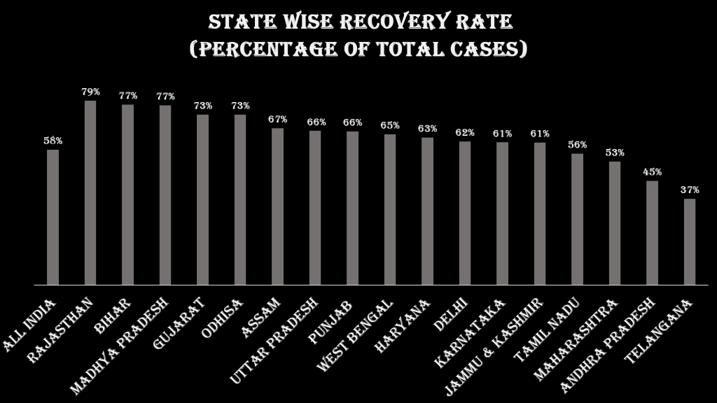 Rajasthan, Bihar and Madhya Pradesh are the top three states among recovery rate while Telangana, Andhra Pradesh and Maharashtra are the bottom three states among all the states which have over 5000 cases of COVID 19. Fourteen states have higher recovery rate than the national average.