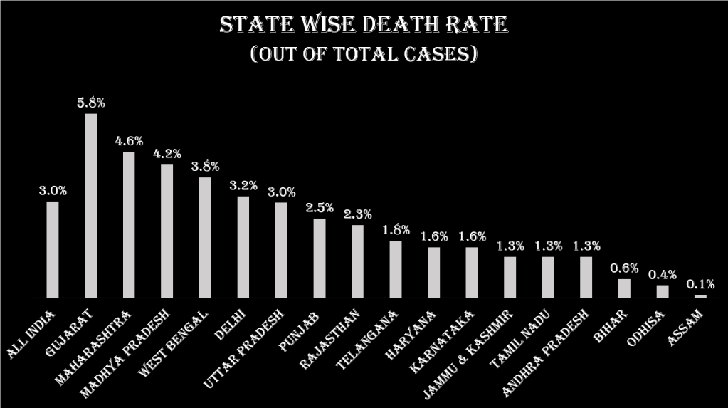Gujarat is the only state in India which has a death rate higher than the world average. Gujarat, Maharashtra and Madhya Pradesh are the top three states in terms of death rate. Assam, Odhisa and Bihar has the lowest death rate among all states with over 5000 cases of corona.