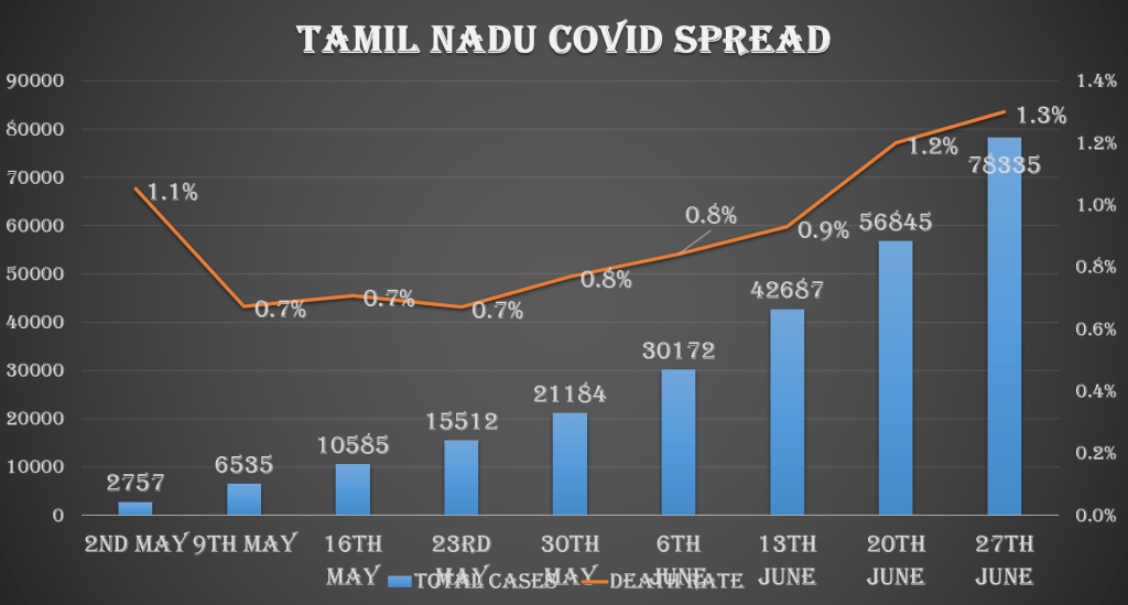 The total number of new cases in Tamil Nadu has been over 21000 this week, the highest till date. There has been marginal increase in death rate from the week of May, 23rd. It needs to be noted here that Tamil Nadu has one of the lowest death rates among the states with highest spread and its recovery rate is also decent.