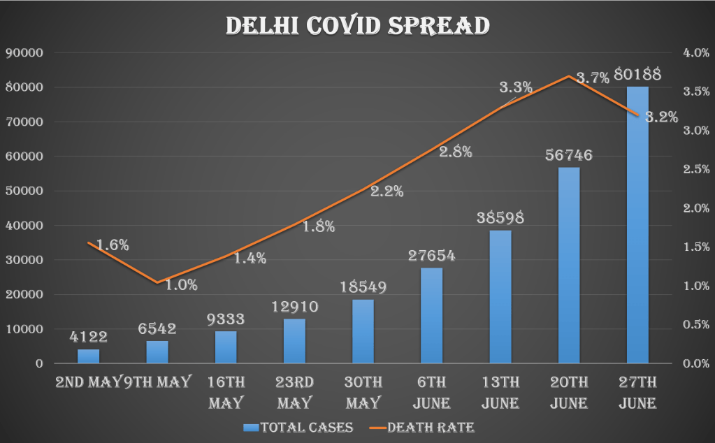 Delhi has seen over 23000 cases this week. The death rate in Delhi has been rising steadily till last week. From 1% in the week of 9th May, the death rate increased to 3.7% till last week. This has declined this week. There has been a 41% growth in the number of cases in Delhi. For a small region like Delhi, this increase is huge and Delhi is the next hot spot for India along with Maharashtra.