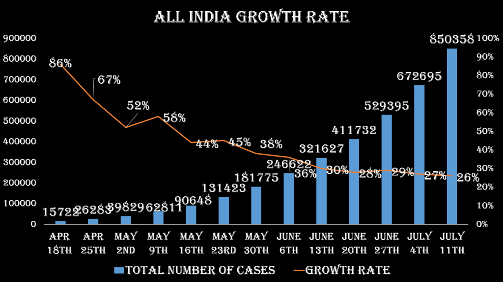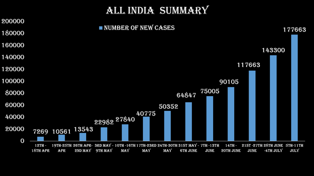 There are over 177663 new cases in the week of 5th to 11th July with 35 states and Union territories impacted all across the country. The weekly growth rate marginally declinedfrom last week. There has been a 26% increase in the total number of cases in the week. During this week there has been a 18% increase in the total number of deaths from 19280 in the week ending on 4th July to 22687 in the week ending on 11th July. So in this week the growth rate of number of deaths was lesser than that of the overall cases.