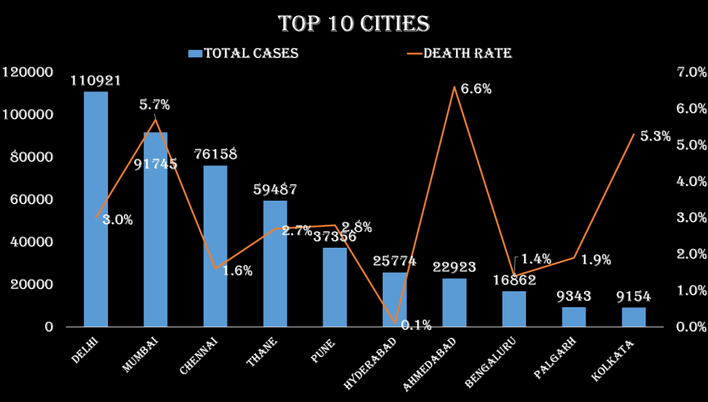 Delhi has the highest number of cases followed by Mumbai. Both cities together account for 24.0% of the total cases in India. But 38% of all the deaths comes from these two cities. In the top 10 cities there are four cities from Maharashtra ( Mumbai, Thane, Pune and Palgarh), one each from Tamil Nadu (Chennai), Telangana ( Hyderabad), Gujarat ( Ahmedabad), Karnataka ( Bengaluru) and West Bengal (Kolkata).