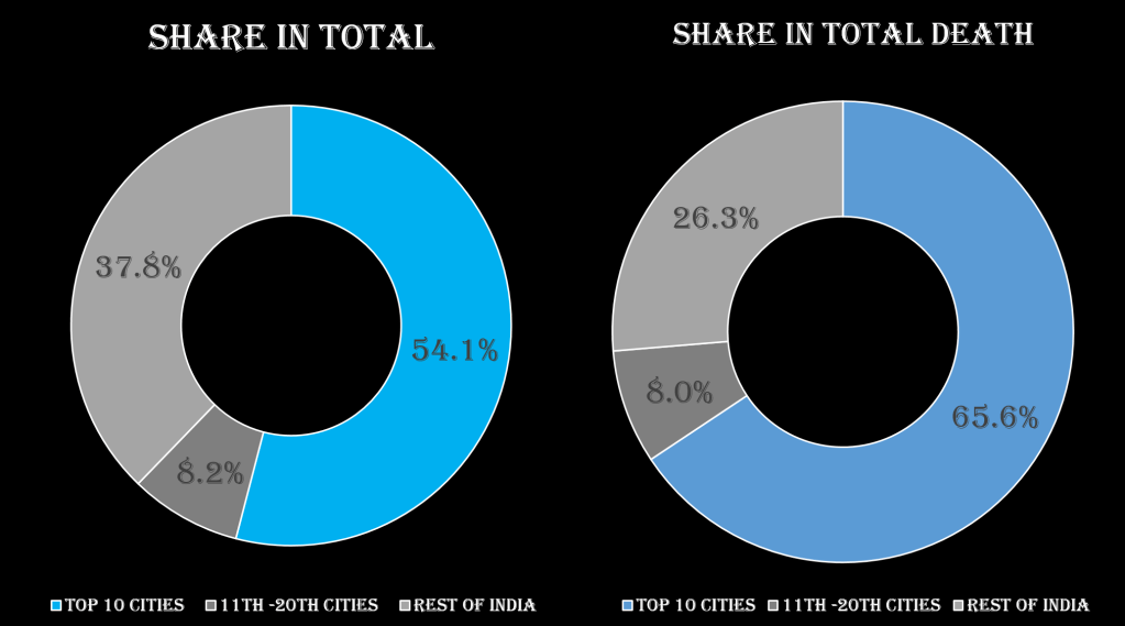 Almost 54% of all the cases in the country comes from 10 cities in the country with over 65% of all the deaths. Another 8.2% comes from the next 10 cities with around 8% of all the deaths. So only 20 cities put together contribute to over 62% of all the cases in the country. The share of rest of India has been rising over weeks suggesting more spread of the virus.