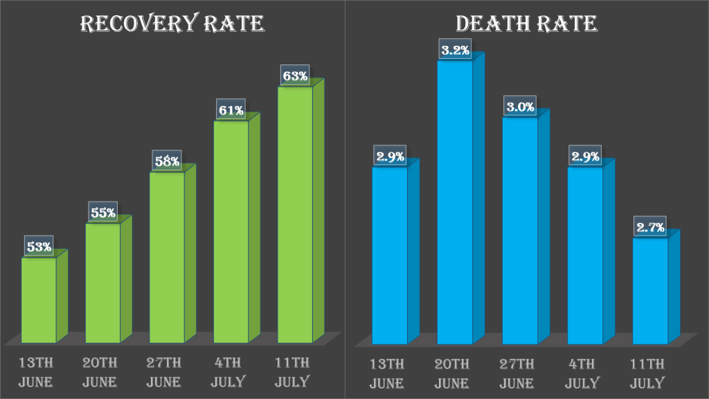 India has maintained a high recovery rate of 63% till July 11th. This is higher than the world recovery rate of 58%. There has been a increase in recovery rate also this week. In terms of death rate, India has lower death rate as compared to the world death rate of 4.4%.