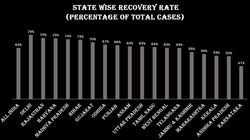 Delhi, Rajasthan and Haryana are the top three states among recovery rate while Karnataka, Andhra Pradesh and Kerala are the bottom three states among all the states which have over 5000 cases of COVID 19. Thirteen states have higher recovery rate than the national average.