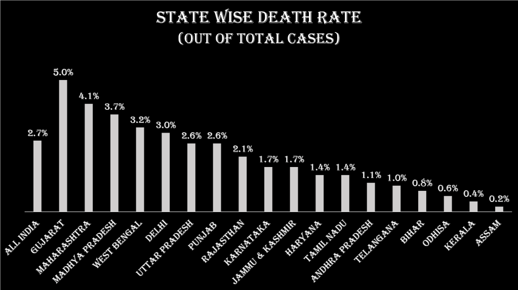Gujarat is the only state in India which has a death rate higher than the world average. Gujarat, Maharashtra and Madhya Pradesh are the top three states in terms of death rate. Assam, Kerala and Odhisa has the lowest death rate among all states with over 5000 cases of corona.