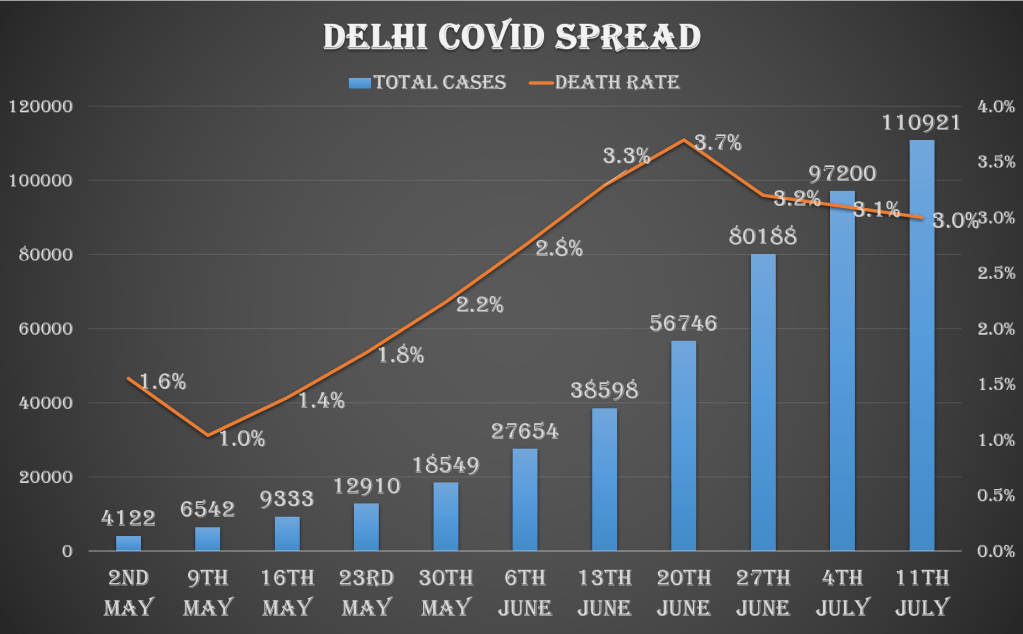 Delhi has seen over 13000 cases this week. There has been a decline in growth in Delhi cases since last week. The death rate also is seeing a marginal decline from last 2 weeks. Delhi had seen a increase in recovery rate as well. This was becoming the hot spot till last week of June with growing number of cases. Now it is showing signs of recovery.