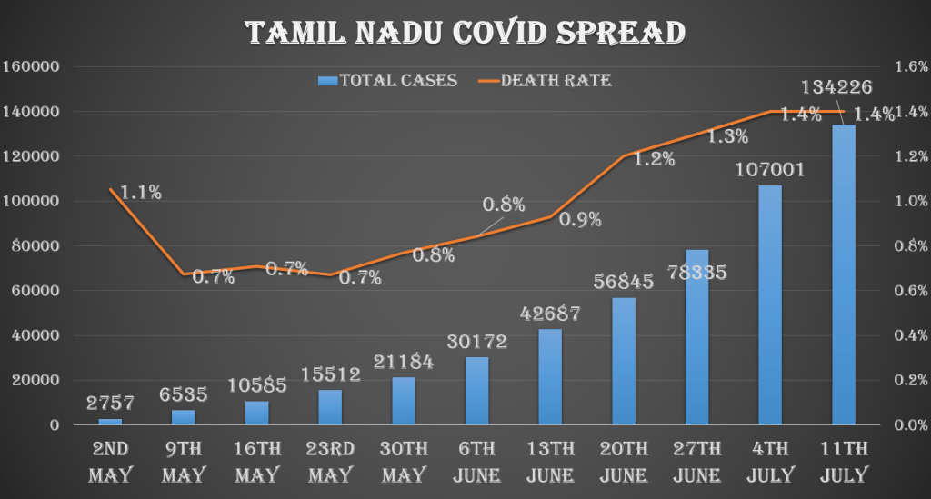 The total number of new cases in Tamil Nadu has been over 27000 this week, the highest till date. There has been marginal increase in death rate from the week of May, 23rd. It needs to be noted here that Tamil Nadu has one of the lowest death rates among the states with highest spread and its recovery rate is also decent.