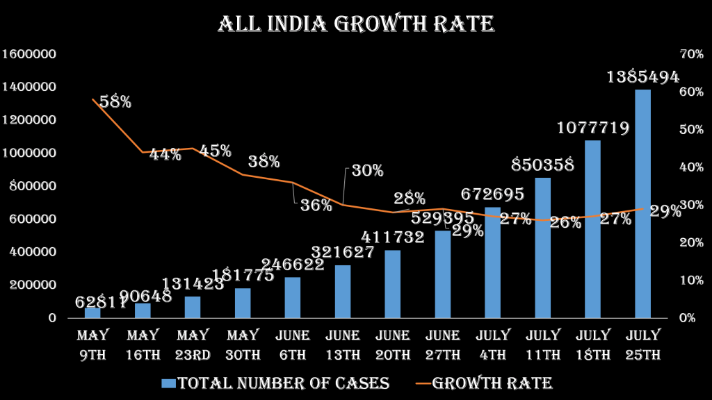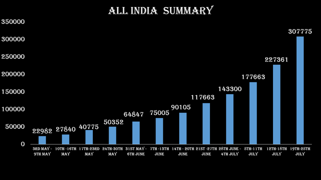 There are over 307775 new cases in the week of 19th to 25th July with 35 states and Union territories impacted all across the country. The weekly growth rate marginally increased second week in a row. There has been a 29% increase in the total number of cases in the week. During this week there has been a 20% increase in the total number of deaths from 26828 in the week ending on 18th July to 32096 in the week ending on 25th July.