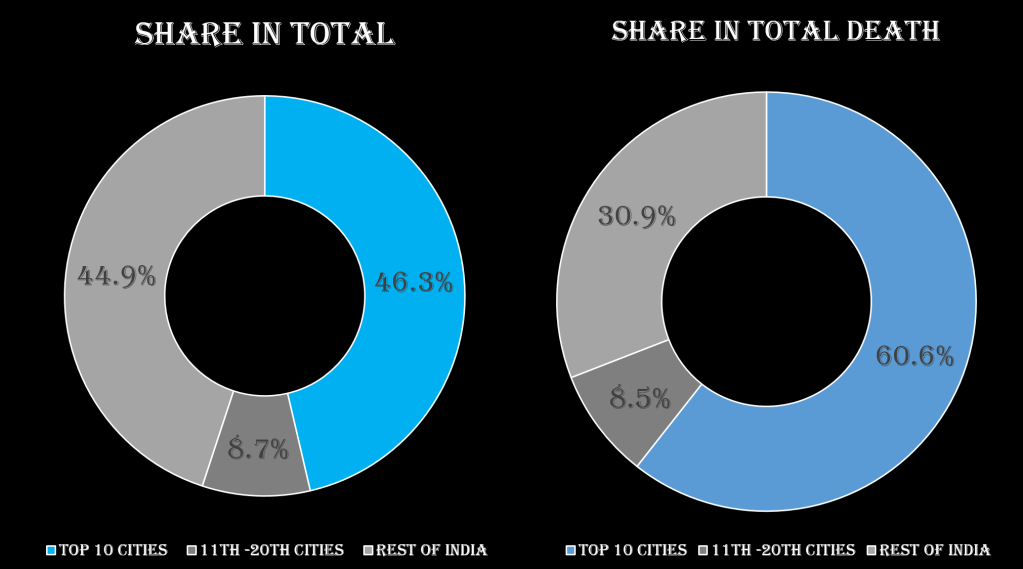 Over 45% of all the cases in the country comes from 10 cities in the country with over 60% of all the deaths. Another 8.7% comes from the next 10 cities with around 8.5% of all the deaths. So only 20 cities put together contribute to over 55% of all the cases in the country. The share of rest of India has been rising over weeks suggesting more spread of the virus.