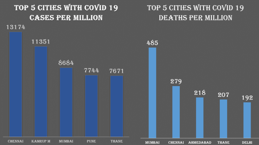 There are over 30 cities in India which have a higher number of cases per million compared to the world average of 2079. Fifteen cities have higher number of deaths per million than the world average of 78. Chennai, Mumbai and Thane are in the top 5 cities both in terms of number of cases per million and number of deaths per million. So utmost focus needs to given to control spread of the virus in these cities. The number of cases per million in Chennai, the top state is comparable to the 10th and 11th place country in the world in terms of number of cases per million. Similarly Mumbai which has the highest number of death per million in the country is comparable to the 9th place country in the world in terms of number of deaths per million.