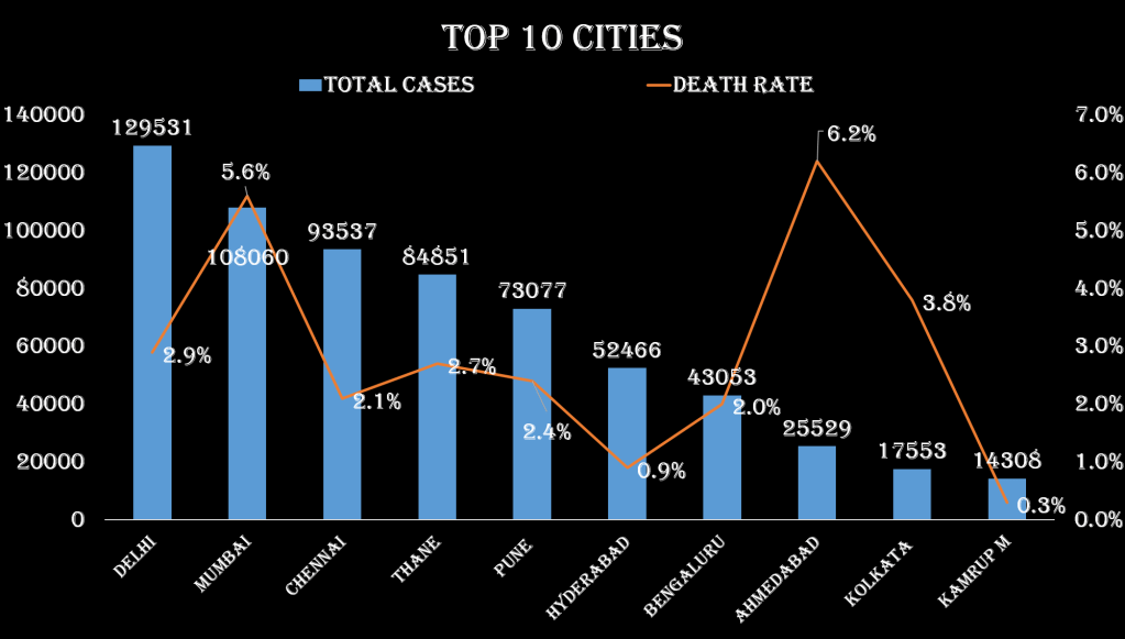 In terms of death rate, Ahmadabad has been leading with over 6.2% death rate. Mumbai which has the second highest number of cases also has a very high death rate of 5.6%. Kolkata is the third city which have a death rate. Both Ahmadabad and Mumbai have higher death rate than the world average.