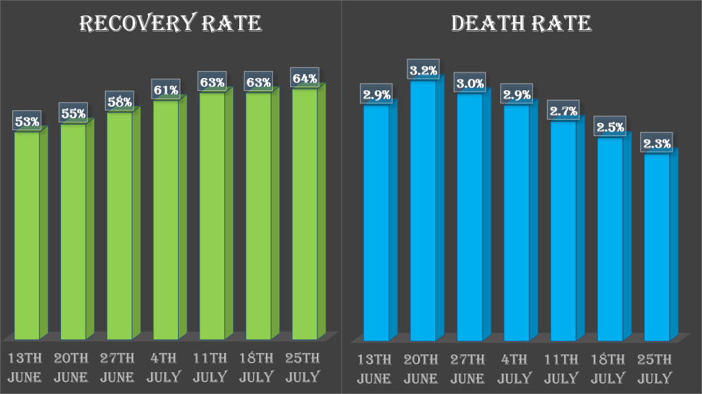 India has maintained a high recovery rate of 64% till July 25th. This is higher than the world recovery rate of 61%. In terms of death rate, India has lower death rate as compared to the world death rate of 4.0%.