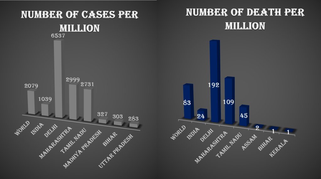 Both in terms of number of cases and number of deaths per million, India has lesser number compared to the world average. However there are 5 states in India which has higher number of cases per million than even the world average and there are 2 states which have higher number of deaths per million than the world average. Among the states with over 10,000 cases, Delhi, Maharashtra and Tamil Nadu not only have the highest number of cases per million but also highest number of deaths per million. Goa and Ladakh are the other two states/UTs apart from Maharashtra, Delhi and Tamil Nadu which have higher number of cases per million than world average. In terms of number of cases per million, Bihar, Uttar Pradesh and Madhya Pradesh have the lowest number of cases among states with over 10,000 cases. Kerala , Bihar and Assam has the lowest number of deaths per million among states with over 10,000 cases.