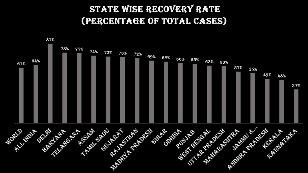 Delhi, Haryana and Telangana are the top three states among recovery rate while Karnataka, Kerala and Andhra Pradesh are the bottom three states among all the states which have over 10000 cases of COVID 19. Eleven states have higher recovery rate than the national average.