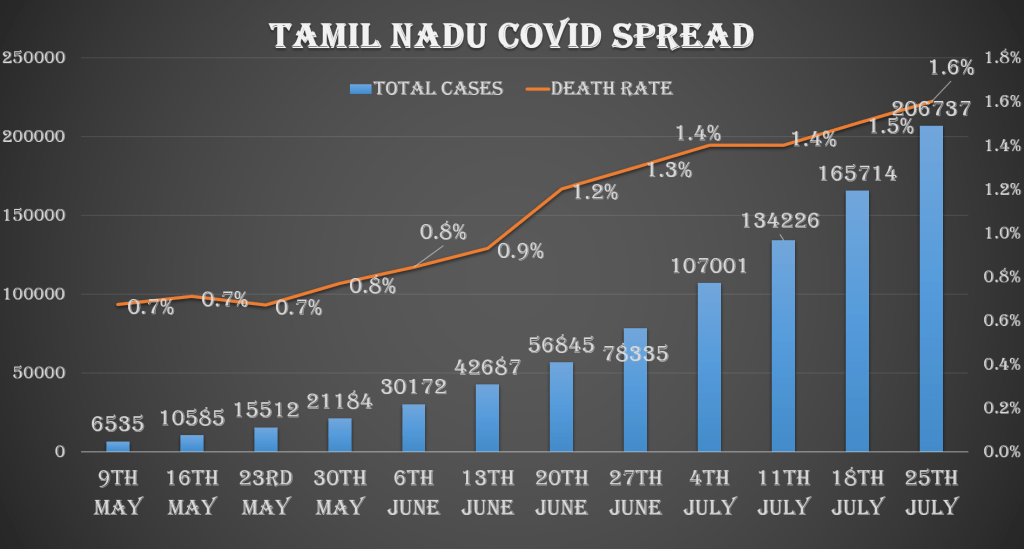 The total number of new cases in Tamil Nadu has been over 41023 this week, the highest till date. There has been constant increase in death rate from the week of May, 23rd. It needs to be noted here that Tamil Nadu has one of the lowest death rates among the states with highest spread and its recovery rate is also decent. Chennai remains the hotspot in the state.