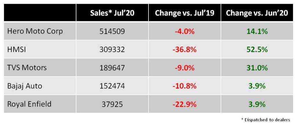 As can be observed, all the major players have taken a major hit in July sales compared to same period a month ago with market leader Hero Moto Corp having the best performance. With the pandemic still raging, people are wary of using public transport and this has had a major effect on the boost in sales from last month especially for the top 3, according to experts.