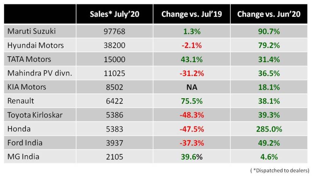 The nation wide lockdown imposed in the last week of March, 2020 in response to the Covid-19 pandemic brought businesses across the country to a near standstill. The situation made matters worse for the automobile segment which had already suffered it’s worst year in nearly two decades in 2019. Sales hit near blank in April with showrooms closed and remained very low even in May. Some positive movement was observed in June with the lockdown gradually eased. Now, July has finally brought some cheer for India’s 2-wheeler and passenger vehicle (PV) makers with all major players registering growth over June. However, in a stark reminder of the severe economic blow of covid-19, year-on-year figures remain in the red for all top 2-wheeler manufacturers and also for many of the PV OEMs.