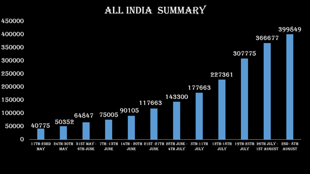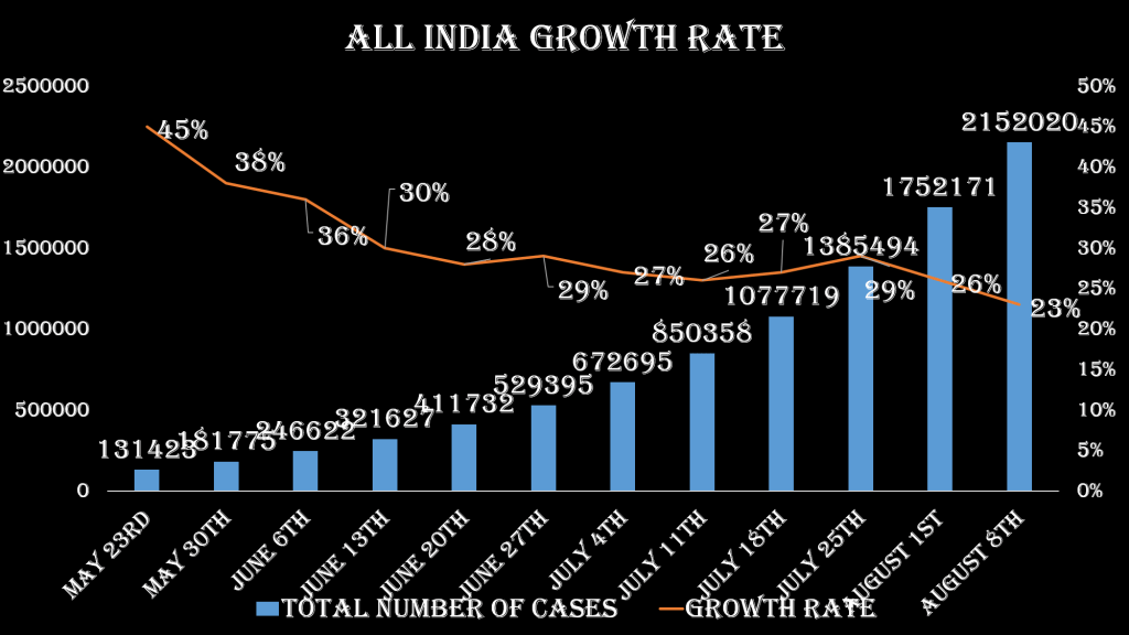 There are over 399849 new cases in the week of 2nd to 8th August with 35 states and Union territories impacted all across the country. The weekly growth rate declined second week in a row. There has been a 23% increase in the total number of cases in the week. During this week there has been a 16% increase in the total number of deaths from 37408 in the week ending on 1st August to 43453 in the week ending on 8th August.