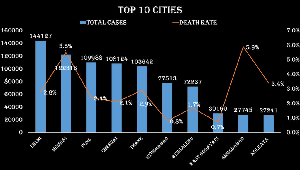 In terms of death rate, Ahmadabad has been leading with over 5.9% death rate. Mumbai which has the second highest number of cases also has a very high death rate of 5.5%. Kolkata is the third city which have a death rate. Both Ahmadabad and Mumbai have higher death rate than the world average.