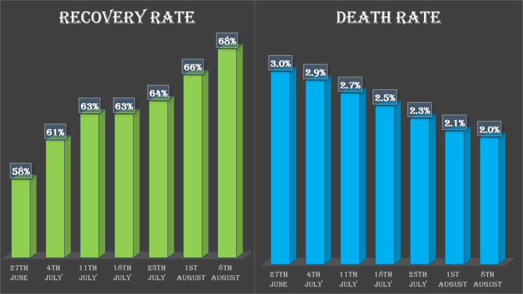 India has maintained a high recovery rate of 68% till August 8th. This is higher than the world recovery rate of 64%. In terms of death rate, India has lower death rate as compared to the world death rate of 3.7%.
