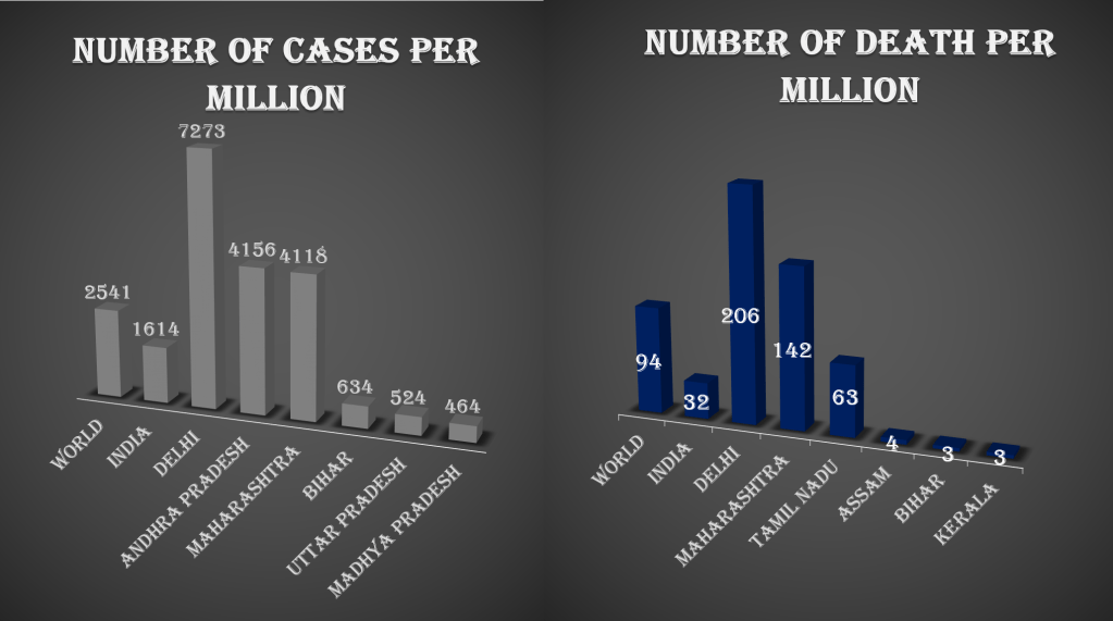 Both in terms of number of cases and number of deaths per million, India has lesser number compared to the world average. However there are 9 states in India which has higher number of cases per million than even the world average and there are 2 states which have higher number of deaths per million than the world average. Among the states with over 20,000 cases, Delhi, Andhra Pradesh and Maharashtra have highest number of cases per million Of them Delhi and Maharashtra not only have the highest number of cases per million but also highest number of deaths per million. Goa, Ladakh, Tamil Nadu, Puducherry, Andamn & Nicobar Islands and Karnataka are the other states/UTs apart from Maharashtra, Delhi and Andhra Pradesh which have higher number of cases per million than world average. In terms of number of cases per million, Bihar, Uttar Pradesh and Madhya Pradesh have the lowest number of cases among states with over 20,000 cases. Kerala , Bihar and Assam has the lowest number of deaths per million among states with over 20,000 cases.