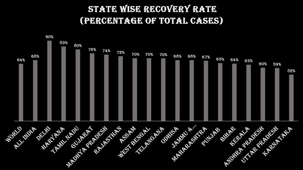 Delhi, Haryana and Tamil Nadu are the top three states among recovery rate while Karnataka, Uttar Pradesh and Andhra Pradesh are the bottom three states among all the states which have over 20000 cases of COVID 19. Nine states have higher recovery rate than the national average.