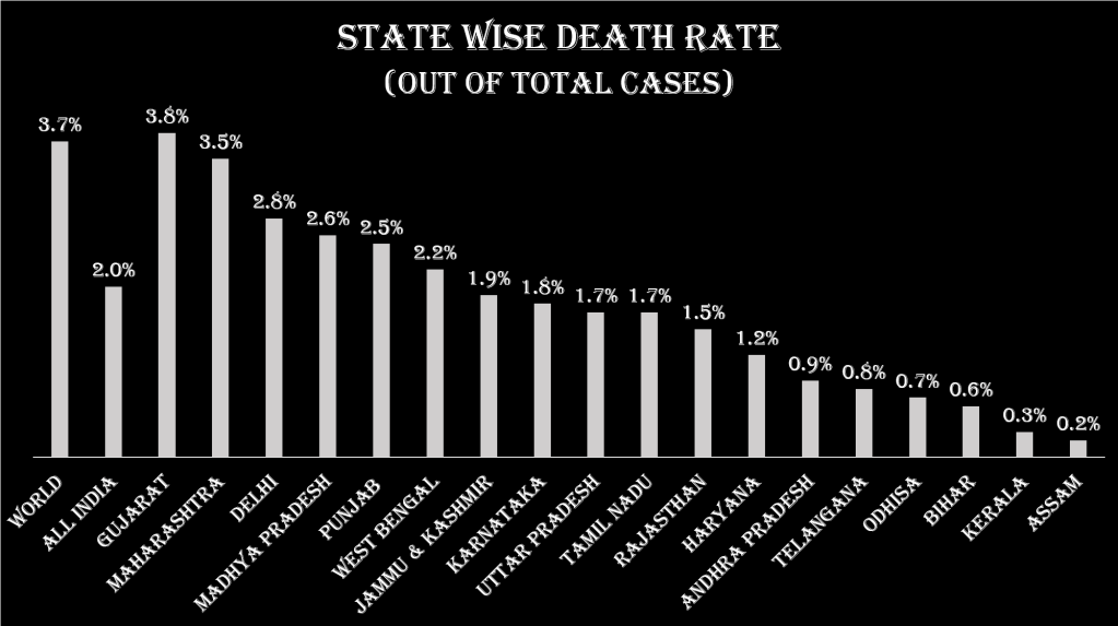 Gujarat is the only state in India which has a death rate higher than the world average. Gujarat, Maharashtra and Delhi are the top three states in terms of death rate. Assam, Kerala and Bihar has the lowest death rate among all states with over 20000 cases of corona.