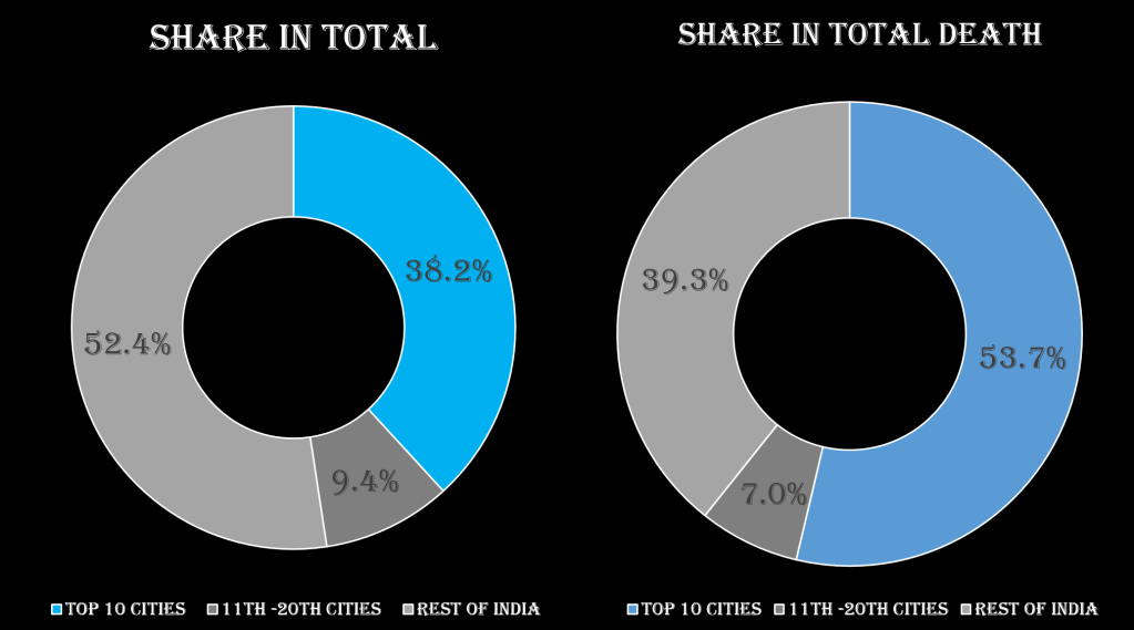 Over 38% of all the cases in the country comes from 10 cities in the country with over 53% of all the deaths. Another 9.4% comes from the next 10 cities with around 7.0% of all the deaths. So only 20 cities put together contribute to over 47.6% of all the cases in the country. The share of rest of India has been rising over weeks suggesting more spread of the virus.