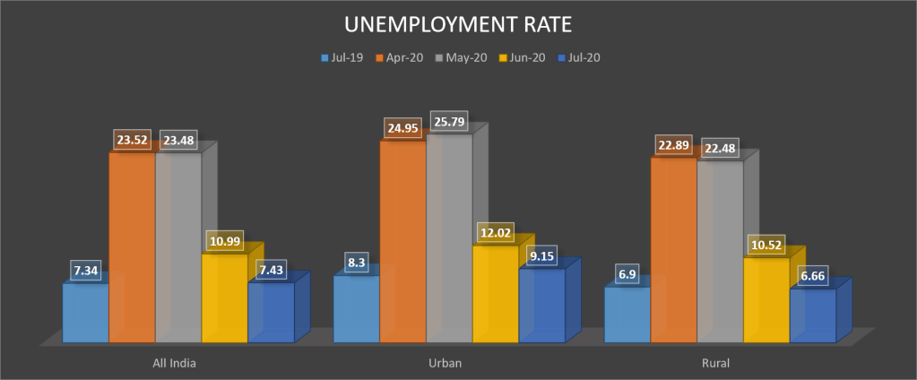 The unemployment rates had seen a record increase in the month of April and May. However with the unlock 1 starting from June, 1st, there has been a significant decline in unemployment rate in the month of June, 2020. It further declined in July. The unemployment rate for rural India is comparable with the unemployment rate one year back. But for urban India the unemployment rate in July, 2020 is still more than 100 basis points higher than that of July, 2019. The urban centers are still fighting with COVID and there are intermittent lock downs and restrictions.