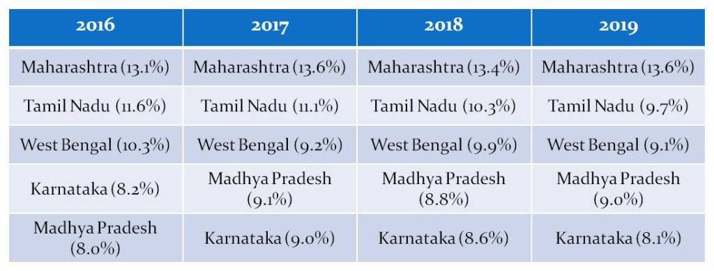 The gender ratio among suicide victims in 2019 was approximately 70:30 for Males:Females. More than 2/3rd of male suicide victims (68.4%) were married while the same figure was 62.5% among female victims. Like last 3 years, in 2019 also, the top 5 states in terms of suicides were Maharashtra, Tamil Nadu, West Bengal, Madhya Pradesh and Karnataka with these 5 states together accounting for 49.5% of all suicides in the country during the year – down marginally from 51.0% share in 2018.