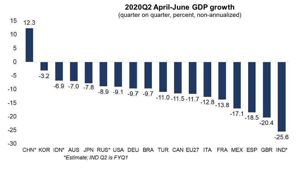 With the world reeling under the onslaught of the pandemic, all major economies barring China suffered contraction in the Apr-Jun quarter with India, UK, Spain and Mexico the worst sufferers.