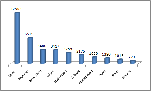 Among large cities, Delhi had the highest no. of crimes recorded against women during 2019 – 12, 902 cases which was 28.4% of the total of 19 large metropolises. Mumbai followed with 6519 cases (14.3% of total). Among the top metros, Chennai had the least no. of cases – 729 for a rate per lakh population of 16.9. Among these 19 cities, Jaipur had the highest rate of crime against women at 235 per lakh population.