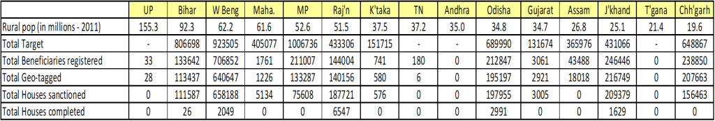 In majority of these states, not a single house has been completed. Uttar Pradesh, India’s most populous state and home to more 155 million people in its rural areas (census 2011), has only 33 beneficiaries registered in the current fiscal with not a single house sanctioned. Bihar, the next most populous (92.3 mln rural popn) has sanctioned 13.8% and completed 0.003% of its target houses. The situation is no better in the smaller states.