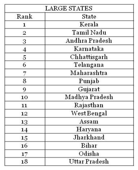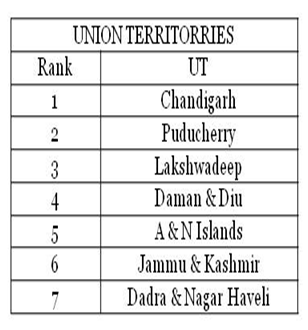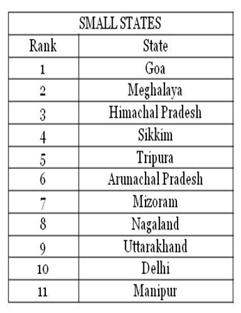 Among small states, Goa was ranked first with an index score of 1.745 points, followed by Meghalaya (0.797) and Himachal Pradesh (0.725). The worst performing small states were: Manipur (-0.363), Delhi (-0.289) and Uttarakhand (-0.277). Chandigarh (1.05) was rated the best performing union territory, followed by Puducherry (0.52) and Lakshwadeep (0.003). The bottom 3 UTs were: Dadra & Nagar Haveli (-0.69), Jammu & Kashmir (-0.50) and Andaman & Nicobar Islands (-0.30). The full rankings are given below: