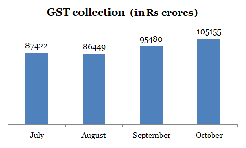The gross GST collection in October comprised of: CGST – Rs. 19, 193 crore, SGST – Rs. 25, 411 crore, IGST – Rs. 52, 540 crore and Cess – Rs. 8011 crore. The total revenue earned by central and state governments after regular settlement in the month of October is Rs. 44, 285 crore (central) and Rs. 44, 839 crore (states).