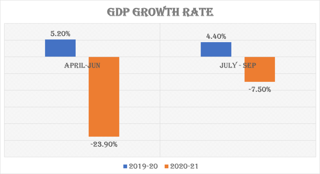 The Ministry of Statistics and Programme Implementation has recently published the growth numbers of second quarter of FY 20-21. The first quarter witnessed a record fall in GDP growth rate to -23.9% mainly because of the nationwide lockdown due to the COVID-19 induced pandemic. The second quarter starting from July, 2020 witnessed relaxation of lockdown with the economy gradually opening up. Moreover, the Government and the Reserve Bank of India also announced host of economic packages to enable the recovery.