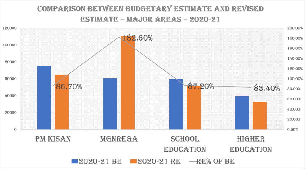 One of the major aspect of any budget remains how much of the allocated fund has been spent in the current fiscal year. Because the budget happens before the fiscal ends, we get a revised estimate and not the true actual figures. But a comparison of budget estimates and revised estimate will be a good measure on how much is expected to be spend out of the total allocated fund for different aspects.