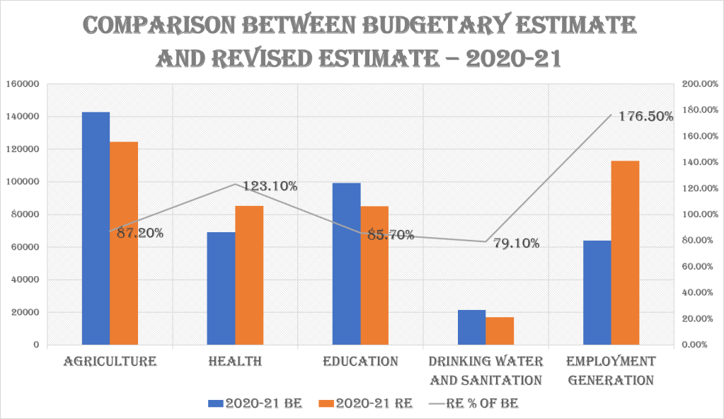 As expected given the pandemic there has been a surge in expenditure in health shooting the revised estimate higher than the budget estimate. But during same time, the revised estimate of drinking water and sanitation has been significantly lower than the budgetary estimate for 20-21. The total spending for both school education and higher education showed a decline against the budgeted allocation in FY 2020-21. The decline had been higher for higher education.