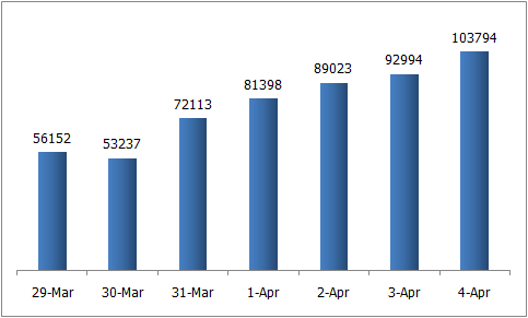 The COVID-19 pandemic in India, now in a second wave, is witnessing a very aggressive and sharp spike once again, a little over a year after the pandemic’s first wave raged across the nation. Yesterday, 4th April, India registered 1, 03, 794 new COVID infections (as per covid19india.org). This is the highest number of new infections the country has ever witnessed in a single day and also the first time that the daily count of new infections has crossed the 1-lakh limit. The previous daily high of 97, 894 was logged on September 17th, 2020. The total case load in the country reached 1, 25, 89, 019 with active cases standing at 7, 38, 694.