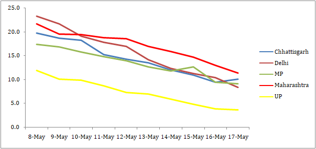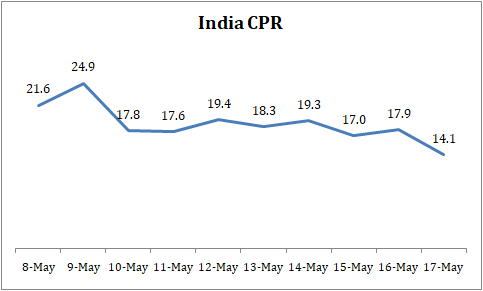 The case positivity ratio i.e. proportion of positive tests stood at 14.1% on 17th May as compared to 21.6% on 8th May.