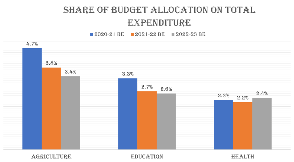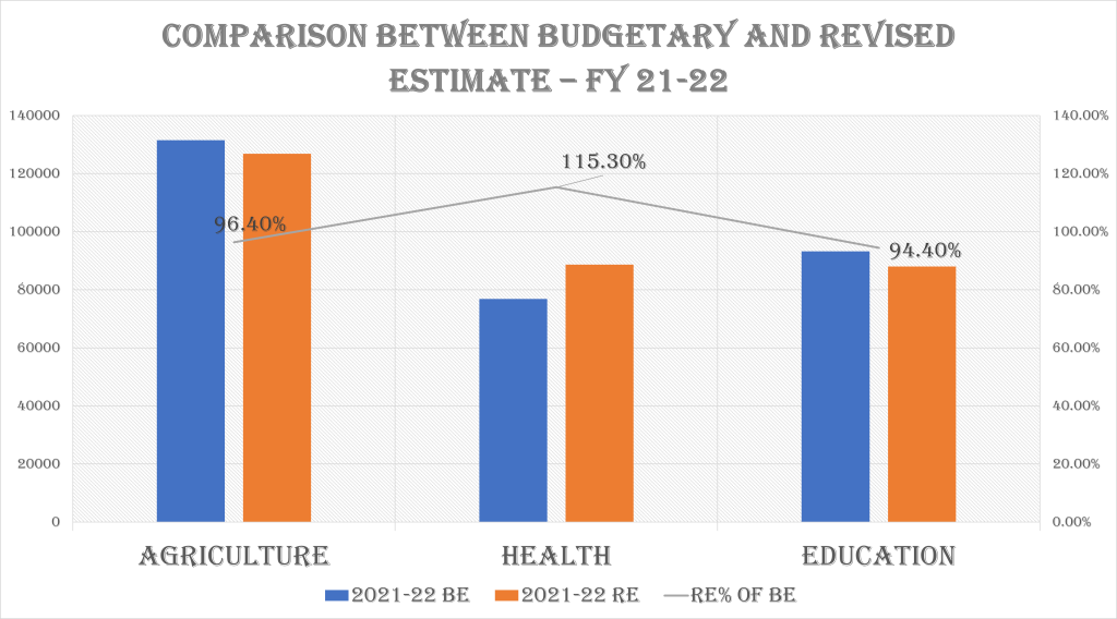 As expected, given the pandemic, there has been more unplanned spending in health and welfare than the budgeted amount. It was debated during the last budget itself, that the allocation on health should have been more. The allocated amount for FY 21-22 was less than the actual spending of FY 20-21 by about 7%. In reality the revised estimate of FY 21-22 is actually even 7% more than the actual spending in FY 20-21. So the higher spending in health over the budgeted amount is purely because of the lower allocation. The spending on both agriculture and education is some what less than the allocated amounts.